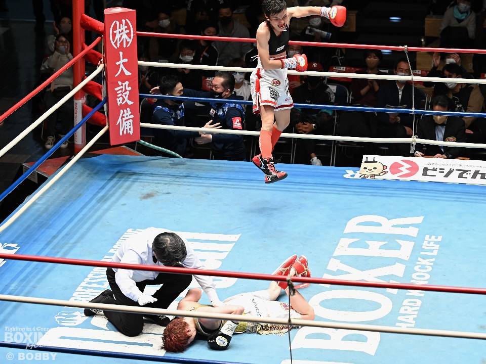 豪快に倒した多田が王座奪還に成功した。右フックで仕掛ける宮尾に対し、サウスポー多田は、長いリーチを活かして左ストレートを決めると、足を使いながら見栄えの良いボクシングを展開。宮尾はプレスをかけて単発の右を当てるが、多田はワンツーが冴えわたった。すると9回、多田の左カウンターがジャストミート。前のめりにバッタリと倒れた宮尾を見てレフェリーがノーカウントで試合を止めた。