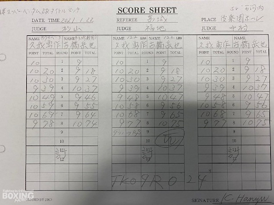 死闘を制した古橋が新チャンピオンに輝いた。前半は久我が左ボディから右フックを叩きつけてペースを掌握。試合の流れが変わったのは4回。古橋が右フックでグラつかせて反撃した。前半終了時の公開採点は、久我がリード。6〜7回も久我の回転力が勝ったが、古橋は被弾しながらもボディにコツコツと集めてチャンスを伺った。8回、古橋は右フックから連打で棒立ちにさせてチャンスを作ると、9回に右を打ち込んでレフェリーストップに持ち込んだ。