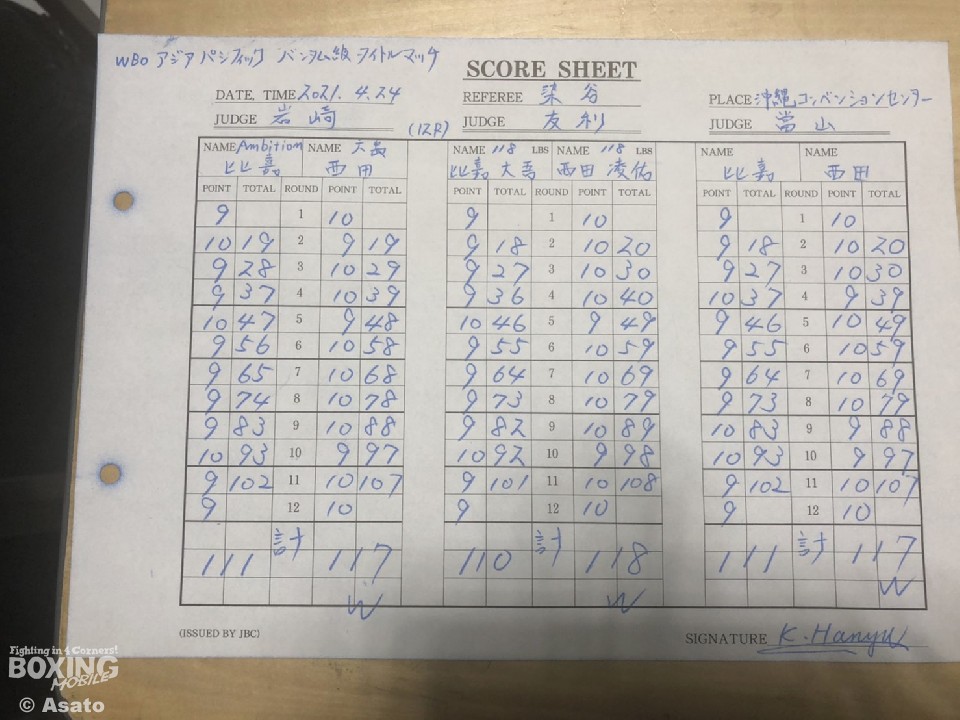 アウェイ戦を大差判定勝利で終えた西田は「無理に打ち合わずに足を使って比嘉選手をコントロールすることを心がけた。その中で左カウンターやアッパーを合わせたが作戦通りに戦うことができた。比嘉選手は、圧力が強かったしフェイントも上手かったが12ラウンド集中することができた。敵地とは考えずに比嘉選手に勝つことだけを考えていた。ベルトを獲れて素直にうれしい。少し休んでさらに上を目指したい」と金星を喜んだ。