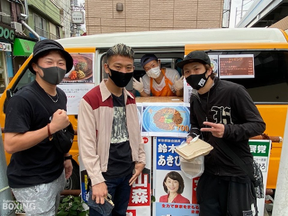 取材中、偶然にも元OPBF東洋太平洋フライ級王者の中山佳祐(32=ワタナベ)がカレーを買いに来た。中山はこれまでにも何度か船井氏のカレーを買いに来ている常連だ。さらにその5分後には日本フェザー級1位の渡部大介(29=ワタナベ)、そのすぐ後に日本バンタム級10位の堤聖也(25=角海老宝石)も現れた。