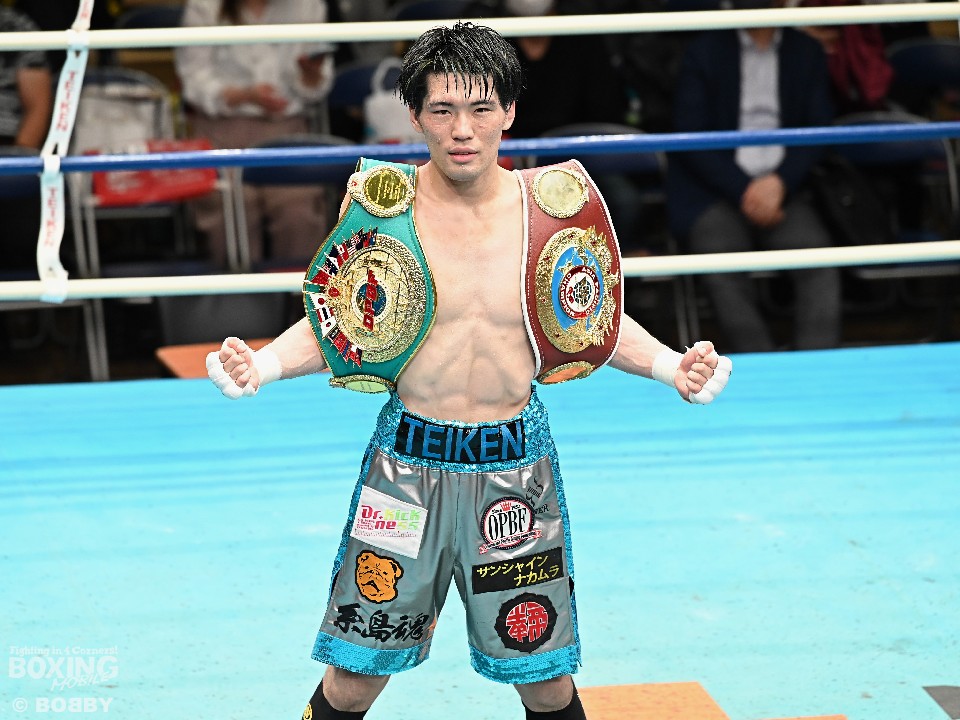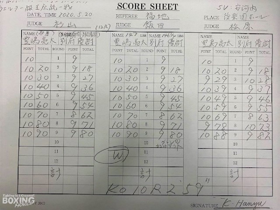 終始、冷静な試合運びを見せた豊嶋が2本のベルトを巻いた。序盤は、別府が出入りを意識したボクシングで相手のパンチを外すのに対し、豊嶋はプレスをかけてボディを狙った。4回終了時の公開採点は40-36×2、39-37×1で豊嶋がリード。これでリズムに乗った豊嶋は、左ボディで動きを止めると7回に右アッパーでダウンを先取。ポイントをさらに広げた豊嶋は、着実にダメージを与えて10回に左フックで2度目のダウンを奪いフィニッシュした。