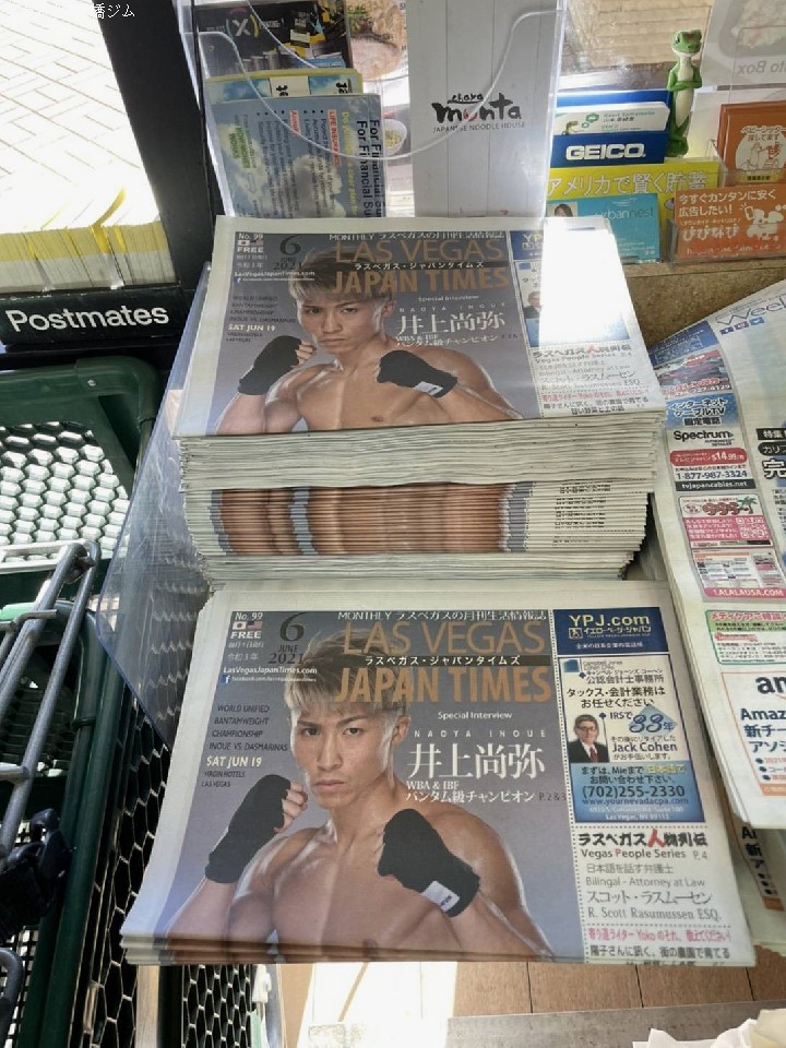 現地の日本人向け新聞、ラスベガス・ジャパンタイムズの一面、裏一面、2〜3ページにインタビュー記事が掲載されている。世界を震撼させる"モンスター"の2度目のラスベガス登場に現地は盛り上がりを見せている。