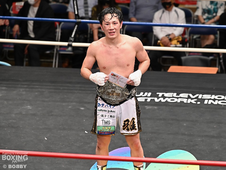 サウスポー永田が距離を詰めてくるのに対し、鈴木は左アッパー、左ボディで迎え撃つとワンツーを好打しペースを掌握。鈴木は的確なパンチでダメージを与えると、前半終了時の公開採点で49-46×1、50-45×2と大きくリードした。ポイントで優位に立った鈴木だが、打ち急がずにジャブから左ボディ、右ボディストレートと多彩な攻撃を披露。逆転を狙う永田は7回にボディを効かせたが、ここを踏ん張った鈴木は、その後も着実にポイントを重ねて最終10回にフィニッシュした。鈴木がデビューから6戦目で新王者に就いた。