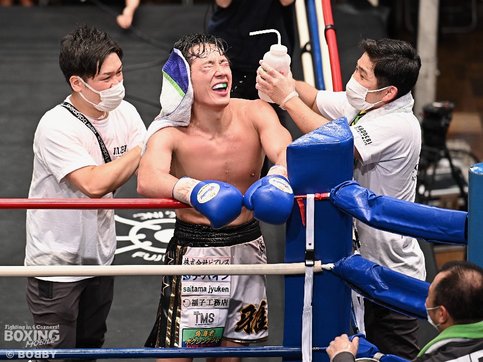 続けて「ポイントでリードしていたが、永田さんは後半にペースを上げてくると思っていたので前半はフルマークで勝っていたが、イーブンの気持ちで戦った。7ラウンドにボディが効いて心が折れかけたが、インターバル中に田部井さんが声をかけてくれたおかげで立ち直ることができた」と、コンビを組む田部井トレーナーに感謝した。