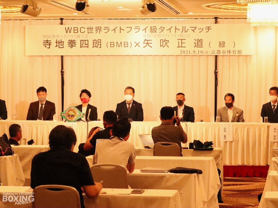 WBC(世界ボクシング評議会)ライトフライ級王者の寺地拳四朗(29=BMB)の次戦が決定!試合をプロモートする真正ジムは5日、新大阪ワシントンホテルプラザで会見を開き、拳四朗と挑戦者で同級1位の矢吹正道(28=緑)が意気込みを口にした。日本人対決による注目の世界戦は、9月10日(金)に京都市体育館で開催される「THE REAL FIGHT」で行われる。