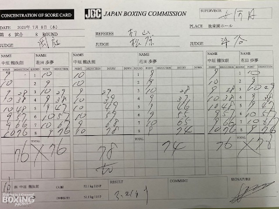 8ラウンドの濃密な技術戦は、決着がつかず新チャンピオンは誕生しなかった。ロングレンジでの距離の探り合いから、サウスポー中垣がジャブから左ストレートを決めれば、花田も右ストレートを好打し対抗。21歳の中垣と19歳の花田によるテクニック合戦が続いた。7回、花田が左ボディを突き刺しチャンスを作ったが、中垣は最終8回にアグレッシブに攻めてポイントを挽回した。