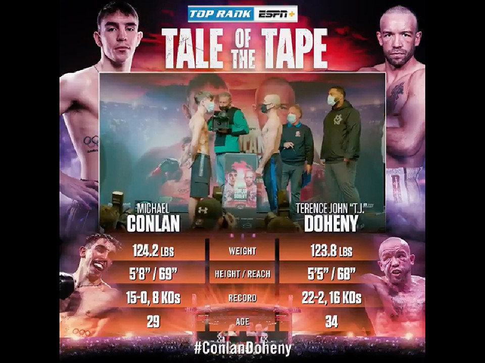 フェザー級リミット57.1kgをコンランは800gアンダーの56.3kgでクリア。ドヘニーはさらに1kg少ない56.1kgで秤を降りた。