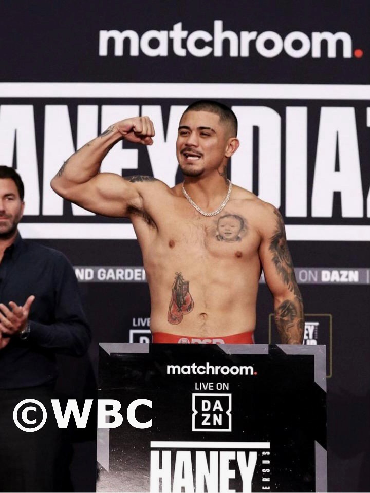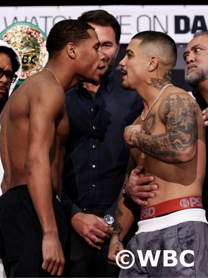 米国ラスベガスで開催されるWBC世界ライト級王座統一戦の前日計量が4日、MGMグランドで行われた。正規王者のデビン・ヘイニー(23=米国)がリミットの135lbで計量を終えると暫定王者のジョセフ・ディアス(29=米国)は、134.4lbで計量台を降りた。計量後のフェイスオフでは、両者共に十分に挑発し合って気合いを見せた。