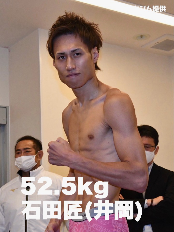 元世界3階級制覇王者の田中恒成(26=畑中)とIBF(国際ボクシング連盟)スーパーフライ級5位の石田匠(29=井岡)が10日、愛知県刈谷市内の病院で前日計量に臨み、リミットちょうどの52.5sでパスした。