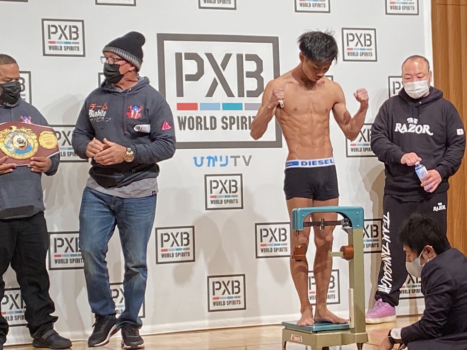先に計量を終えたのはチャンピオンのウィルフレッド・メンデス(25=プエルトリコ)。47.5kgだった。次に計量台に上がったのは谷口将隆。リミットの47.6kgで難なくクリアした。フェイスオフの撮影時には、メンデスからプエルトリコの国旗を手渡されると、谷口は笑顔で応じた。