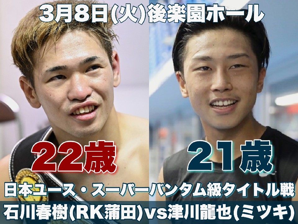 日本ユース・スーパーバンタム級王者の石川春樹(22=RK蒲田)は、関西のホープ津川龍也(21=ミツキ)を迎えて初防衛戦に臨む。石川は、昨年6月に名古屋で2回TKO勝ちし王座奪取に成功した。決定力の高い左フックで今年はさらに上を目指す。