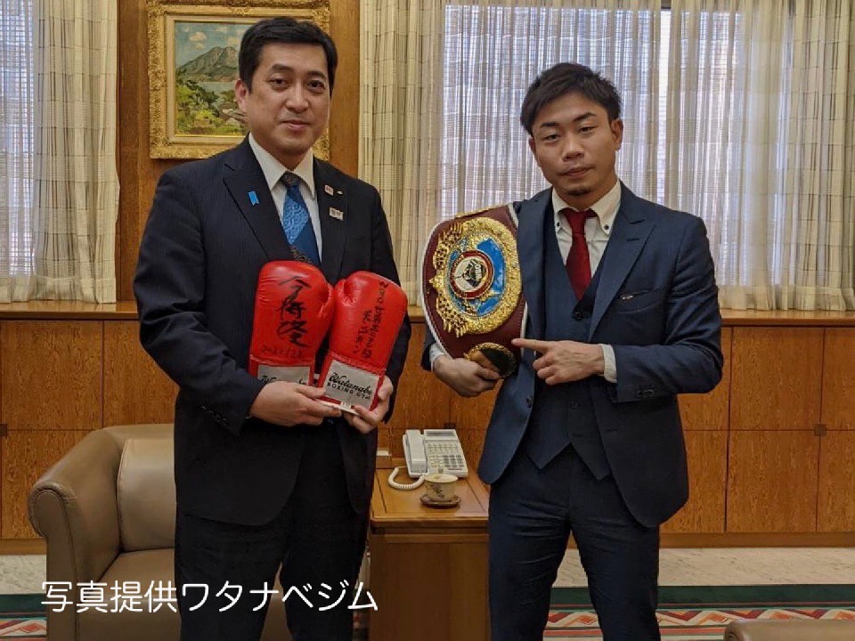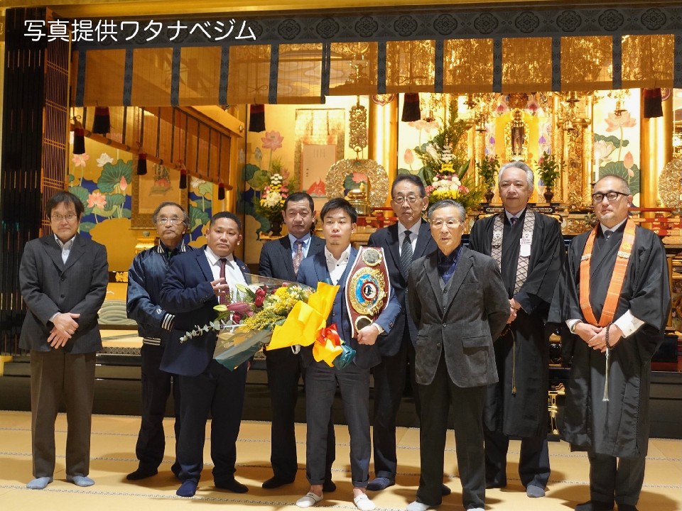 藤善氏(写真:右から3番目)から「龍谷大学ボクシング部から世界チャンピオンが誕生したのは非常にうれしい。これからからも頑張ってほしい」と激励を受けた。
