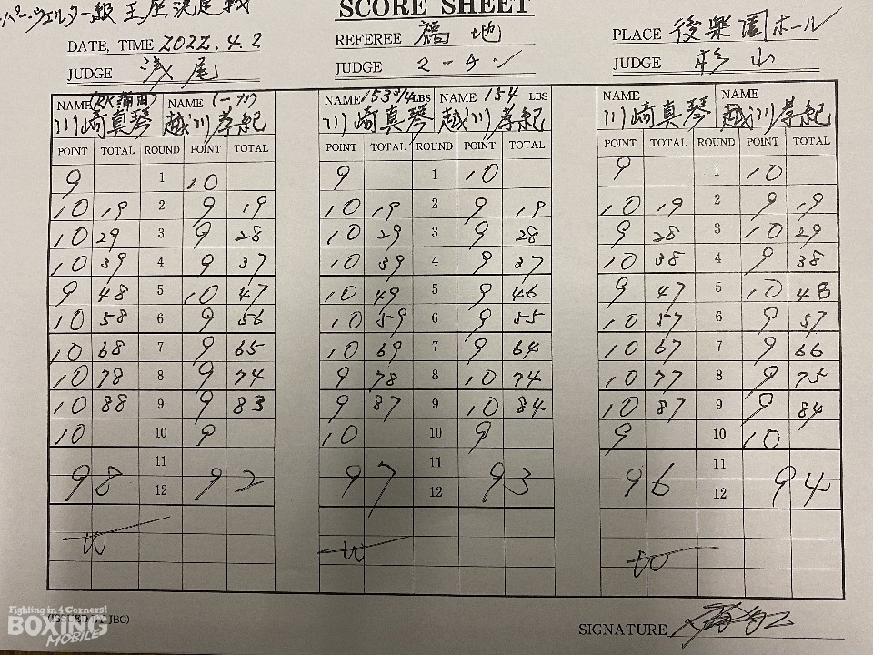 距離を詰める越川に対し、川崎は左ボディを返して応戦。序盤から激しい打撃戦となったが川崎が左ボディ、左フックで攻勢を印象付けた。前半終了時の公開採点は2者が48-47、49-46で川崎、48-47で越川と割れた。ポイントでリードされた越川は手数を増やして反撃に転じるが、川崎は押し負けることなくワンツー、左ボディをヒット。最後まで攻勢をかけ続けた。