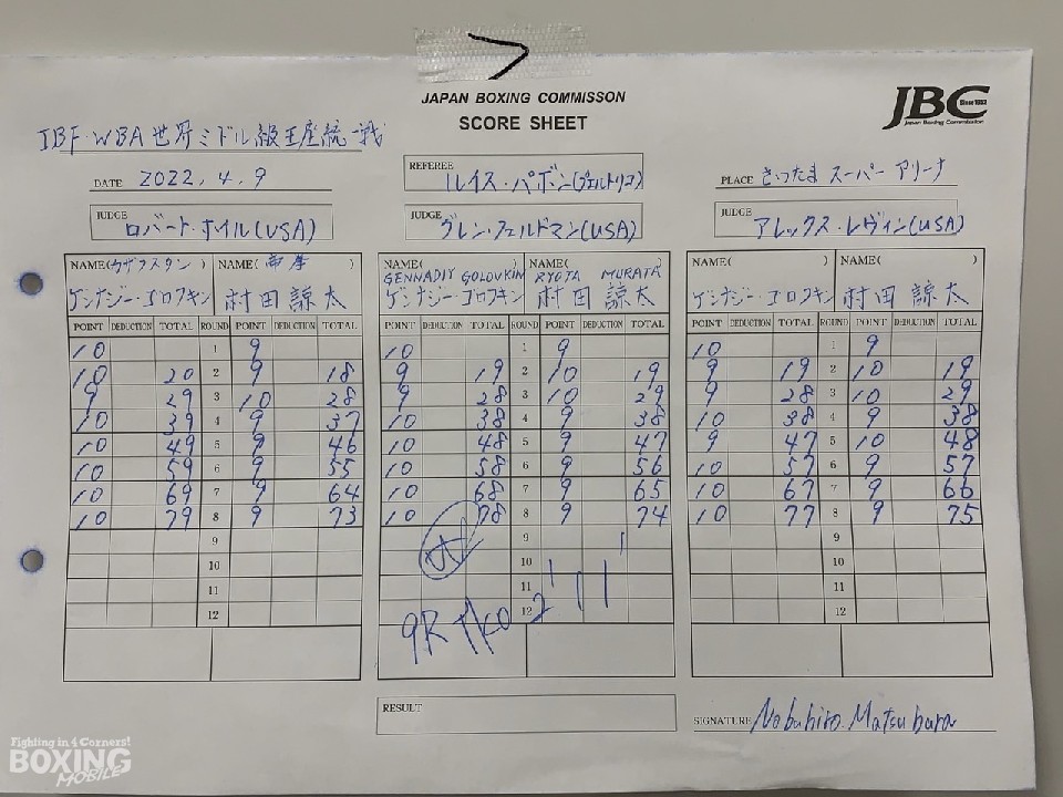 初回から右ストレートを上下に打ち分けてプレッシャーをかける村田が前に出て先に仕掛ける。ゴロフキンは、ボディストレートを嫌いながら、手数はセーブした。ゴロフキンがギアを上げてジャブ、ショートアッパー、左フック、右ストレートと手を出したのは3ラウンド。これにも、村田は下がらず前に出て、右ストレートに力を込めた。徐々に下がりはじめたゴロフキン。緊張感と高揚感が高まってきた。4ラウンドは、ゴロフキンが左の打ち下ろしフックを多用して、手数を増やした。距離が近くなった5ラウンド、ゴロフキンの左フックと村田のアッパーと左右のボディが光った。6ラウンドからは、左の打ち分けでペースを握り始めたゴロフキンだが、村田もロープを背にしてもワンツーで、押し返した。ゴロフキンはステップで被弾を免れた。大きな拍手が2回起きたのは9ラウンド。最初の拍手は、一気に勝負に出たゴロフキンにロープを背にした村田が踏ん張り続けた場面。ワンツーで押し返しもしたが、防戦一方となったところで、村田陣営がタオルを投げた。2度目の拍手は、村田が力尽きた最後のシーン。大きな拍手が会場を包んだ。