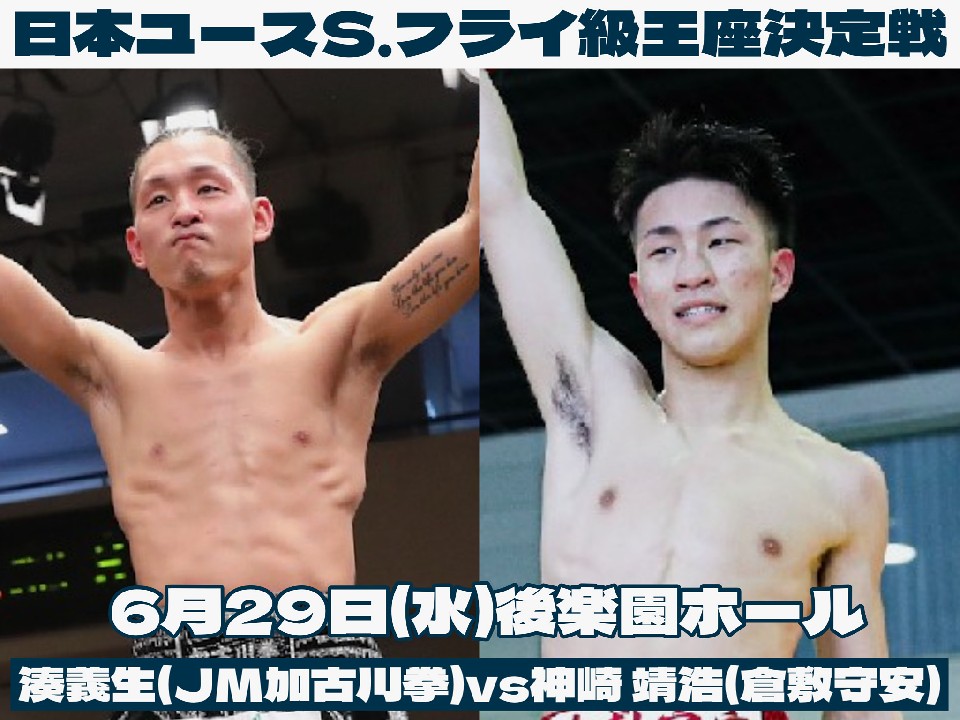 セミファイナルでは、日本ユース・スーパーフライ級王座決定戦、湊義生(23=JM加古川拳)対神崎靖浩(21=倉敷守安)が行われる。