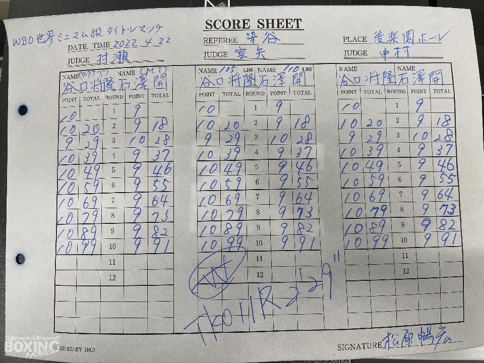 チャレンジャー石澤のパワーを警戒していたチャンピオン谷口は、初回から上下左右に強弱をつけたパンチを出すと、前後左右に体を入れ替えて石澤を翻弄。まとわりつく様に前で石澤の攻撃をかわした。中盤以降は、打って離れて、左右に動いて冷静に試合を進めた。試合を決めたのそは、11ラウンド。ポイントを十分稼いで危なげなく試合を進めたが、仕留めに行った。左ストレートに力を入れると石澤の顔面をヒット。レフェリーが試合を止めた。