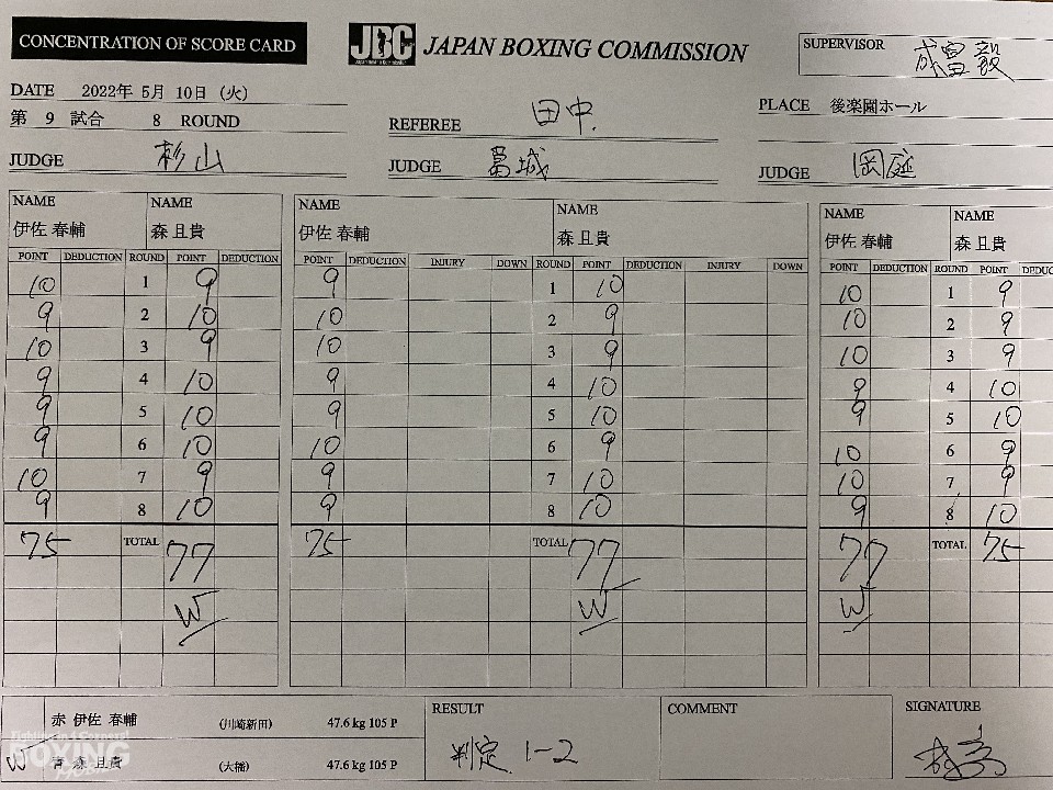 ボディ攻撃に活路を見出した森が勝利を掴んだ。前半は、伊佐がジャブからワンツーに繋げて出入りを意識したボクシングを披露。しかし、「ボディ打ちは選択肢の一つだった」(森)と、4回からボディブローで相手を後退させると、積極的な攻撃でポイントを加点。後半は回転力を活かした打ち合いになったが、森の有効打が上回った。ジャッジ2者の支持を得た森が新チャンピオンに輝いた。