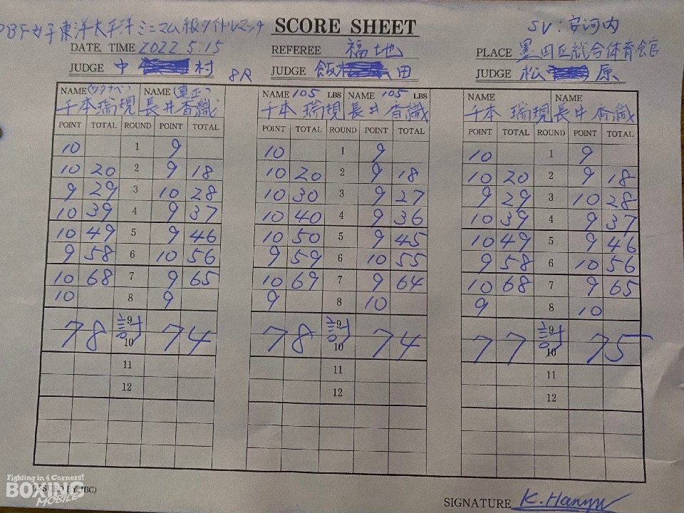 距離を潰してボディを狙う長井に対し、千本はジャブから左ボディに繋げて対抗。やりづらさを発揮する長井に対し、千本は冷静な試合運びでポイントを加点。前半終了時の公開採点をリードした千本は、最後までペースを崩さなかった。