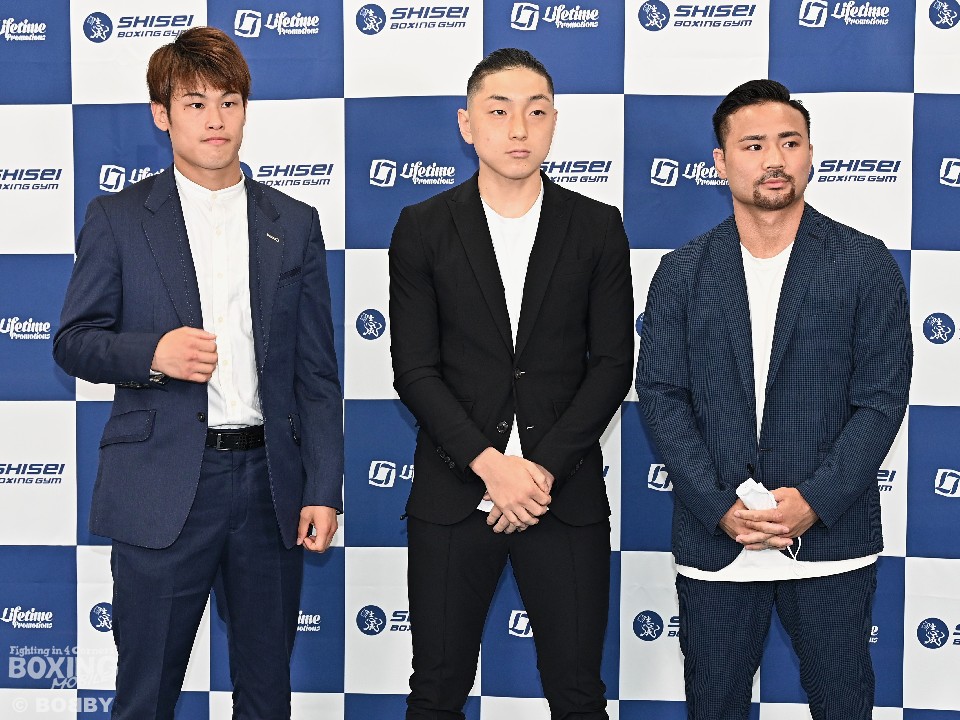 この日の会見には、元WBC世界フライ級チャンピオン比嘉大吾(26=志成)と元WBO-APフェザー級チャンピオン森武蔵(22=志成)に次いで、プロデビュー戦を8回戦で迎えるAIBA世界ユース選手権金メダリストの堤駿斗(22=志成)の3名が登場した。