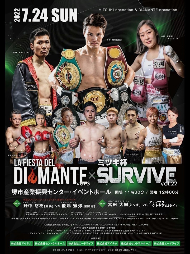 3度目の防衛がかかった大切な一番は、7月24日(日)に大阪・堺市産業振興センターで開催される「LA FIESTA DEL DIAMANTE VOL.3 x ミツキ杯 SURVIVE VOL.22」のメインイベントとして行われる。