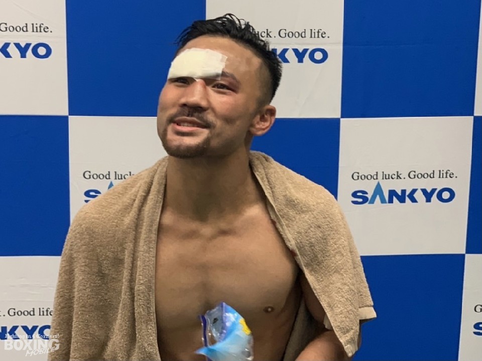 「すみません、倒されました〜。僕より周りが焦りましたよね?」と笑いながら会見に応じた比嘉大吾。「傷に対しては、こんな感じかという印象。切ったときは何も感じなかったが、明日縫う方が怖い」と、深く切った右目上をかばった。
