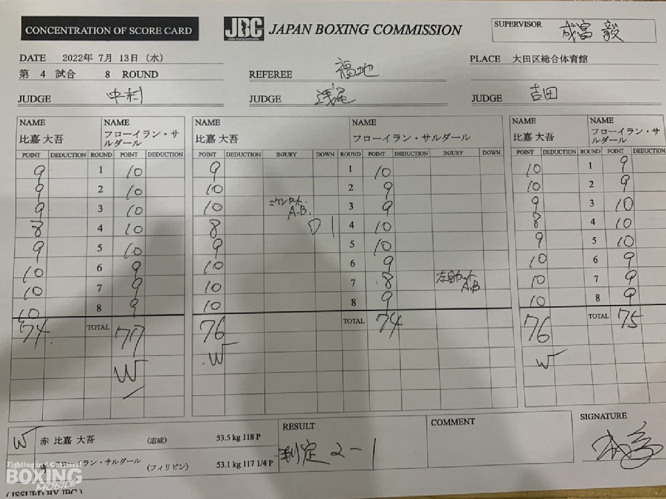 テンポのいいリズムで、鋭い踏み込みから積極的に仕掛けた比嘉は、サルダールのワンツーにも反応して、上々のスタートを切ったが、3ラウンドに、右目上を大きくカット。4回には、右フックをねじ込まれて、まさかのダウン。それでも、冷静にピンチを切り抜けると、後半は、鋭い連打とペース配分で、ポイントを挽回。逆転判定勝利を挙げた。