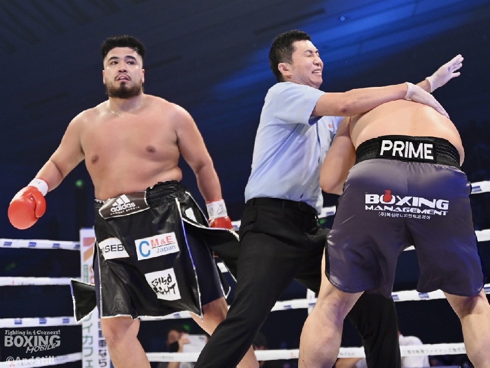 イのパンチをブロックした但馬は、ジャブで顔面を捉えると、左ボディからアッパーを織り交ぜたコンビネーションで攻勢。防戦一方になったイを見て、レフェリーが試合をストップした。