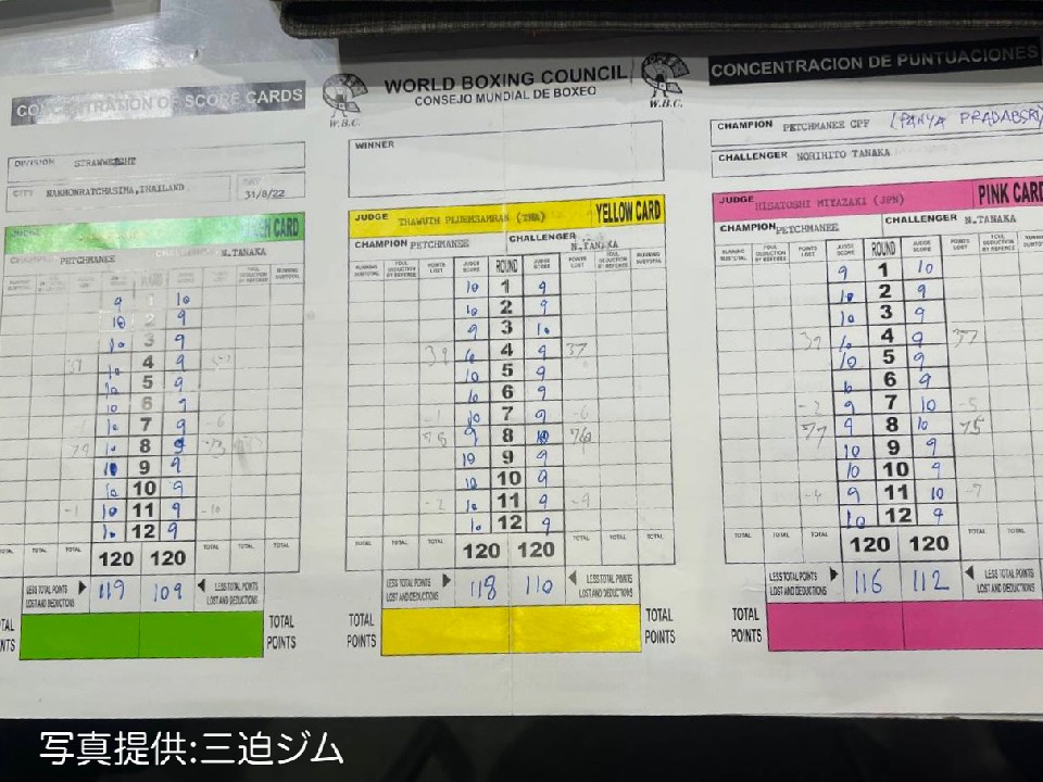 「チャンスはあった。何度も効かせていた。左フックで(王者の)腰を落とした場面もあったし、もう一歩。(王者の)目も腫れ、休みたい、逃げたい、ボディーも嫌がっていることがわかりました。ただ地元タイで見栄えを良くすれば取られないし、そしてパンチも田中に当たって、元気にさせてしまったところもある。倒せないと勝てないぞと、全ラウンドで言い続けていたが、少し見てしまったところですね。試合内容、展開は想定通りでしたが、本人が相手を見すぎて、1発を狙いすぎたと思う」