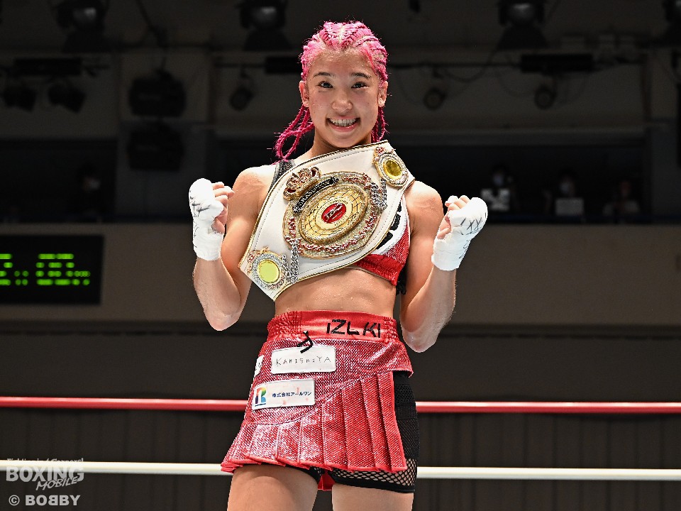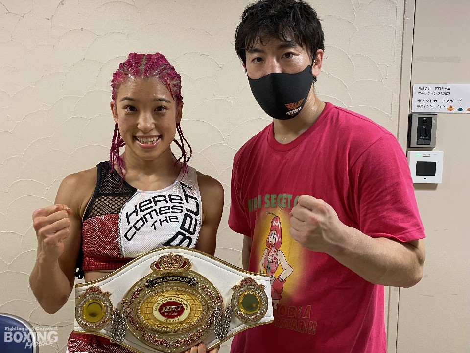3戦目でベルトを巻いた晝田は「前回の反省を少しは活かせたと思う。柳井選手はパンチがあるので、もらわないことを意識した。攻め過ぎないことを頭に置いて戦った。少しは成長したかな」と快勝に頬を緩めた。