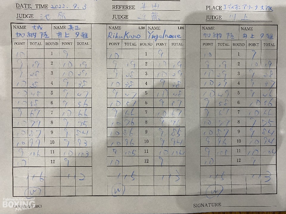 序盤は、右ボディアッパーで体力を削っていく井上に対し、サウスポー加納は、上下に打ち分けて応戦。互角の打ち合いを見せた。中盤、ボディにパンチを集める井上に対し、加納は手数を増やして、ジャッジに攻勢をアピール。わずかに抜け出してきた。11回、井上はサイドに回り込んで、連打で攻勢をかけたが、加納は12回に豊富な手数でポイントを奪い、譲らなかった。接戦を制した加納が新王者に就いた。