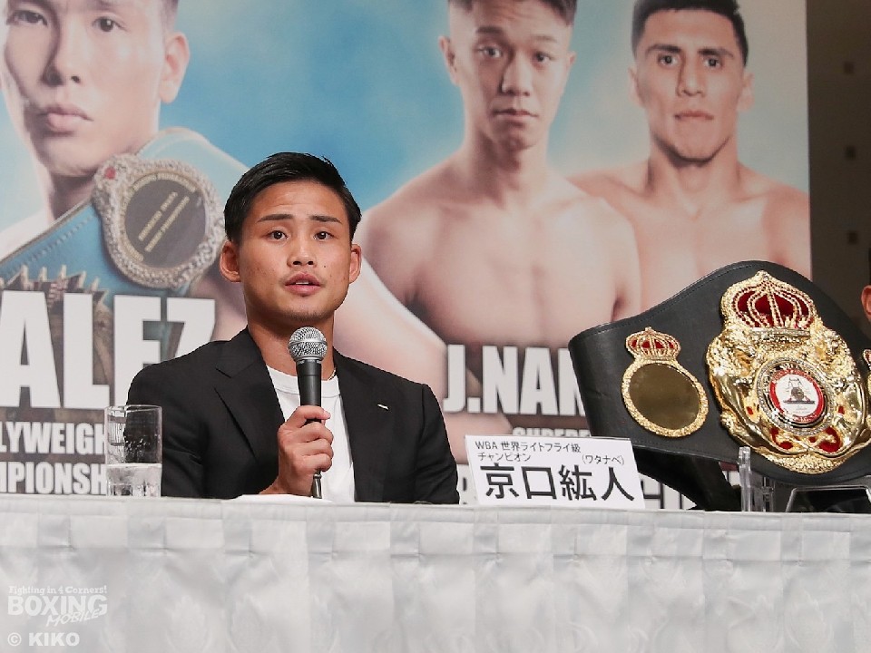 会見の席で拳四朗は、「接近戦が強い」と京口の印象を述べたが、矢吹正道(30=緑)との2度目の対戦で、ファイタースタイルでリベンジを果たしたことを例に挙げ、「接近戦の練習をしてきた。遠い距離でも近い距離でも勝てる。全てにおいて、全部自分の方が優っていると思う」と自信を示した。その上で、WBOの世界戦も同日同会場で行われることにも「同じ階級のベルトが同じ会場に3つ揃う」と笑顔を見せ、日本記録の世界王座13度防衛の夢が途切れた後、世界4団体統一を新たな目標としていることを明言した。