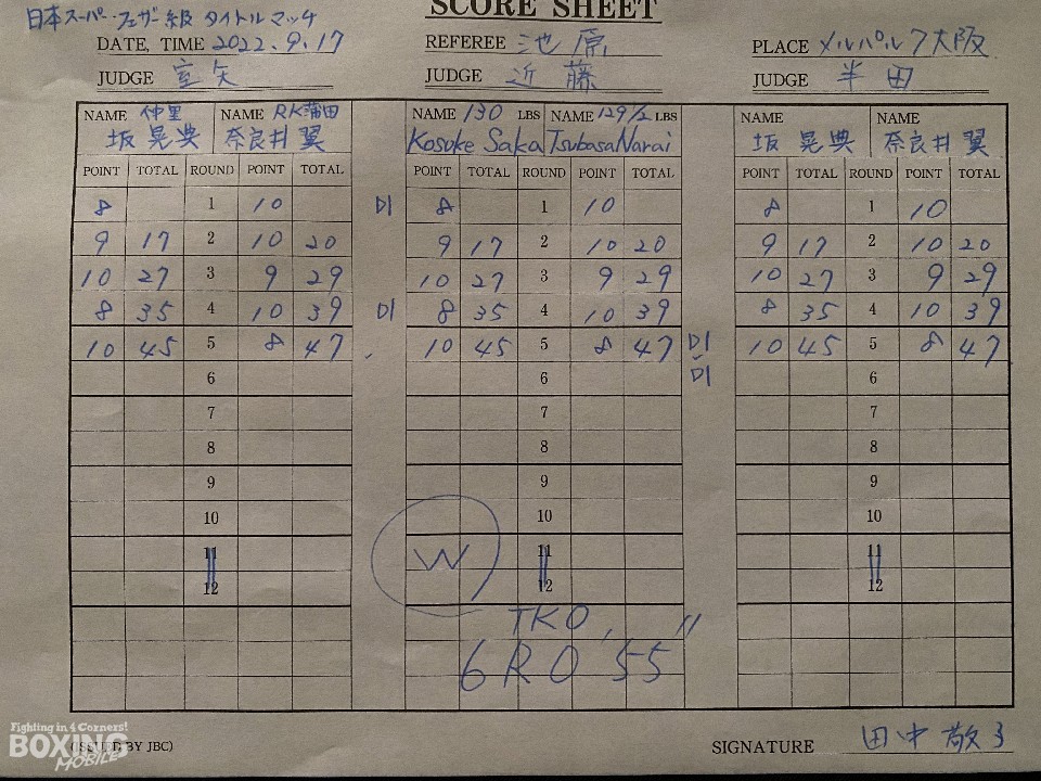 試合後、亀田興毅ファウンダーが「これは年間最高試合でしょう!」と興奮気味に語ったが、ボクシングの魅力が詰まった名勝負だった。初回、挑戦者の奈良井が、右ストレートでダウンを演出。慌てずにじっくりと攻めて、これ以上ないスタートを切った。続く回も、奈良井がグイグイと攻め立てた。ピンチの坂は、3回に上下のコンビネーションから右ストレートでグラつかせて反撃。しかし、奈良井は、4回に右ストレートで、2度目のダウンを奪った。厳しい局面に立たされた坂だが、5回に右カウンターで、ついにダウンを演出。一気にピンチになった奈良井だが、懸命にパンチを返して、勝利への執念を見せた。6回、坂はボディへの連打でダウンを奪うと、連打でレフェリーストップ! 逆転KO勝ちで、2度目の防衛に成功した。