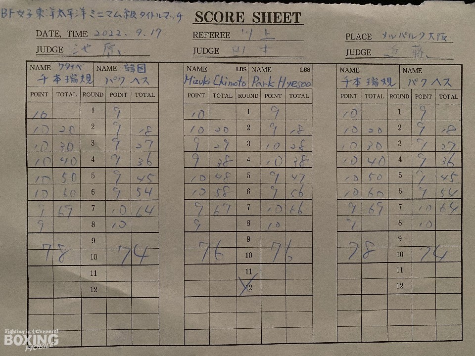 一方、悔しい敗戦となったパクは「世界に出られる良い足場になったし、千本選手はセンスの良い選手で、機会があれば韓国でもう一度試合をしてみたい。そして、今日の試合を応援しに来られた日本のボクシングファンの方々にも感謝しています。また会えたら、もっと良い試合内容で恩返ししたいです」とコメントを寄せた。