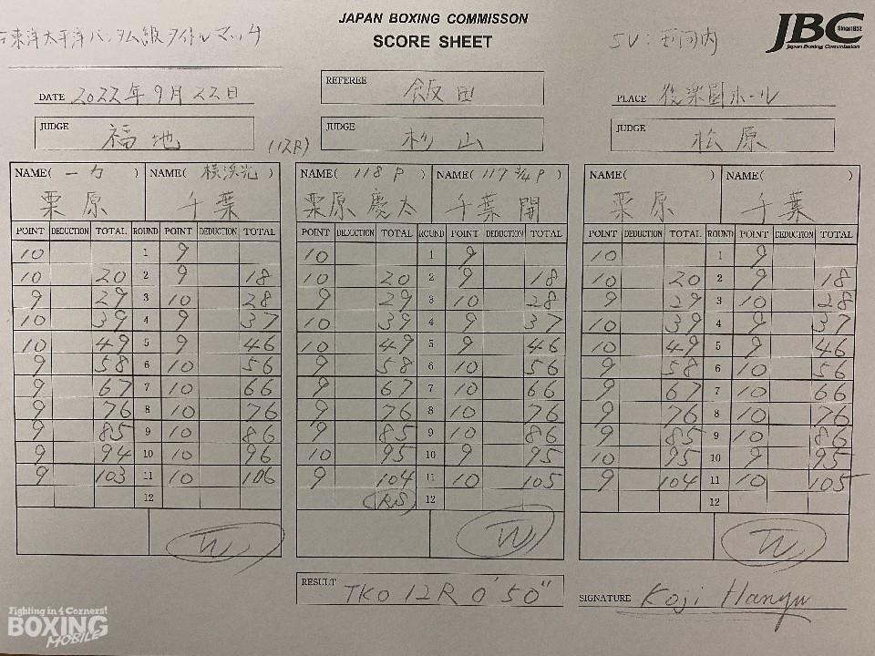 作戦遂行能力の高さを見せた千葉が、チャンピオンを攻略した! 序盤は、栗原の強打を警戒して、サークリングしながら被弾を回避。上手くパンチを外したが、攻勢点には結びつけられず。4回終了時の公開採点は、39-37×3で栗原がリードした。6回、千葉は距離を潰して、回転力を活かした連打で反撃。何度も顔を弾き、ペースを奪い返した。8回終了時に76-76×3にすると、攻勢を強めて9回にポイントで逆転。10回に栗原の連打を浴びてピンチを迎えたが、ここを乗り切ると、最終12回にスタミナが切れた栗原を攻め立て、レフェリーストップに持ち込んだ。