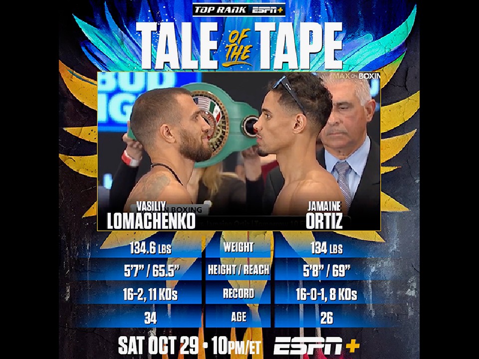 ライト級リミット61.2kgを、ロマチェンコは200g少ない61.0kgでパス。一方のオルティスは、500kgアンダーの60.7kgで秤を降りた。