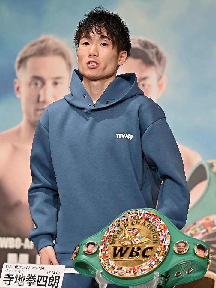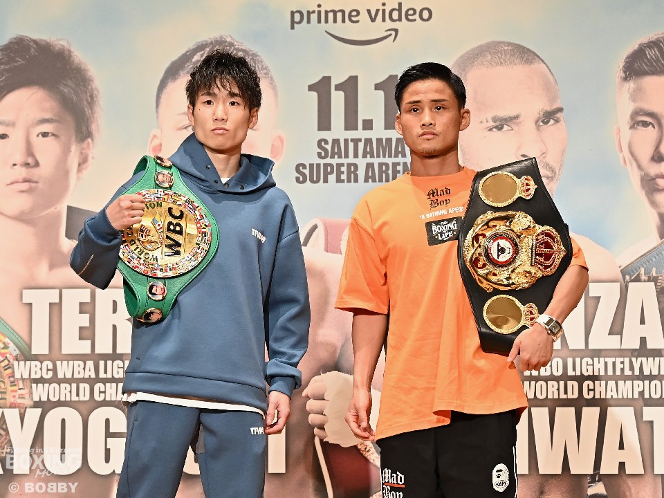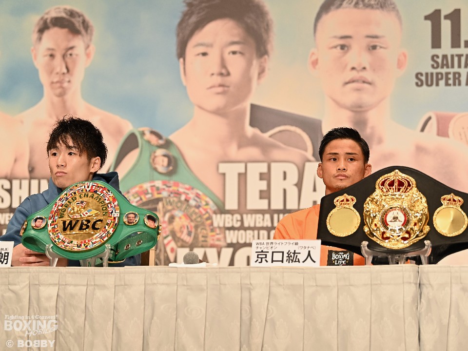 11月1日(火)のメインイベントで行われる、ライトフライ級の2団体王座統一戦で対戦するWBAスーパーチャンピオンの京口紘人(28=ワタナベ)とWBC王者の寺地拳四朗(30=BMB)が揃って顔を見せ、好調ぶりをアピールした。