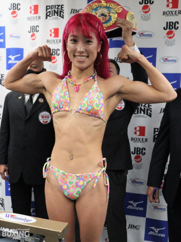 4戦目で世界タイトル初挑戦の晝田は、400gアンダーの51.7sをクリアした。「しっかりと準備ができた。やはりピンク色のベルトは、私が獲る運命だと思う。必ずゲットする」と話すと、「明日は、最強無敵な私を見せることができる」と勝利に自信を示した。