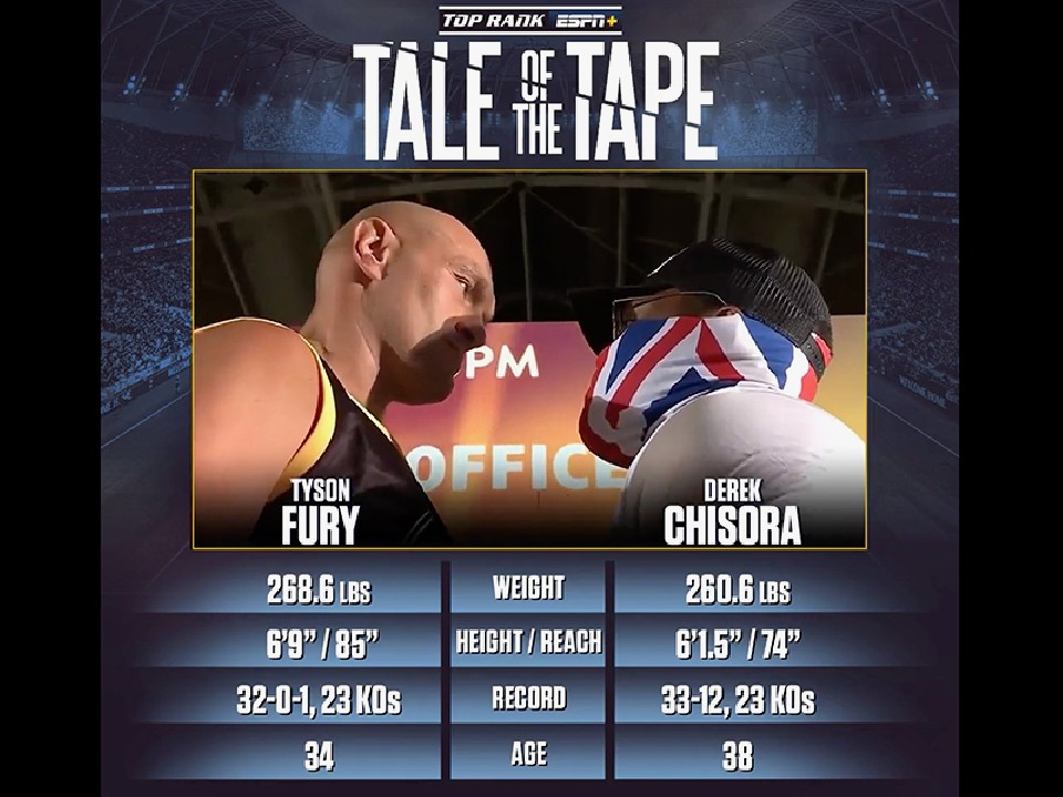 両者は、これまでに2度対戦しており、2011年7月に12回判定、2014年11月に10回終了TKOと、いずれもフューリーが勝利している。チゾラは、直近3連敗から今年7月に再起戦に勝利し、てこのラバーマッチとなる世界挑戦に再び挑む。