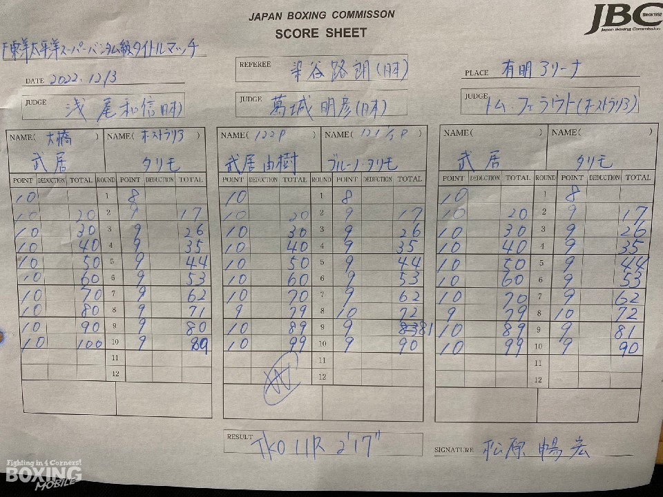 初回にダウンを奪いながらも、突進して来るタリモを相手に、距離を取りながら、左ストレートを打ち下ろしてリズムを作った武居が、レフェリーストップによる11ラウンドに、TKO勝利を挙げた。武居の有効打によるカットで、タリモの試合続行に、待ったがかかった。リング上で武居は「来年、、もっと強くなって帰ってきます。倒れてもおかしくないパンチを打っても、簡単には倒れなかった」と、タリモにリスペクトを伝えた。
