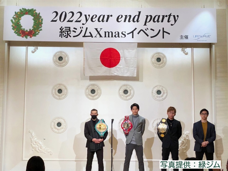 クリスマスイブの24日、名古屋市内のホテルで緑ジムのクリスマス&忘年会が開かれ、選手や関係者60名が出席し、親睦を深めた。