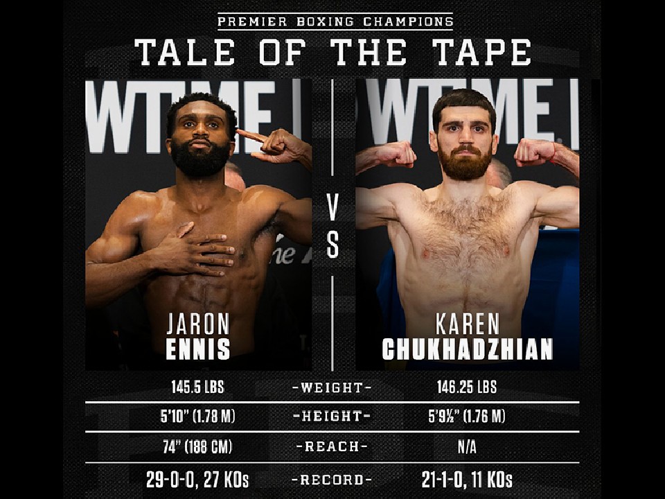 セミファイルでは、IBF(国際ボクシング連盟)ウェルター級暫定王座決定戦で、IBF同級1位の超大型次世代ホープ、ジャロン・エニス(25=米)とIBF同級4位カレン・チュクハジャン(26=ウクライナ)が対戦する。