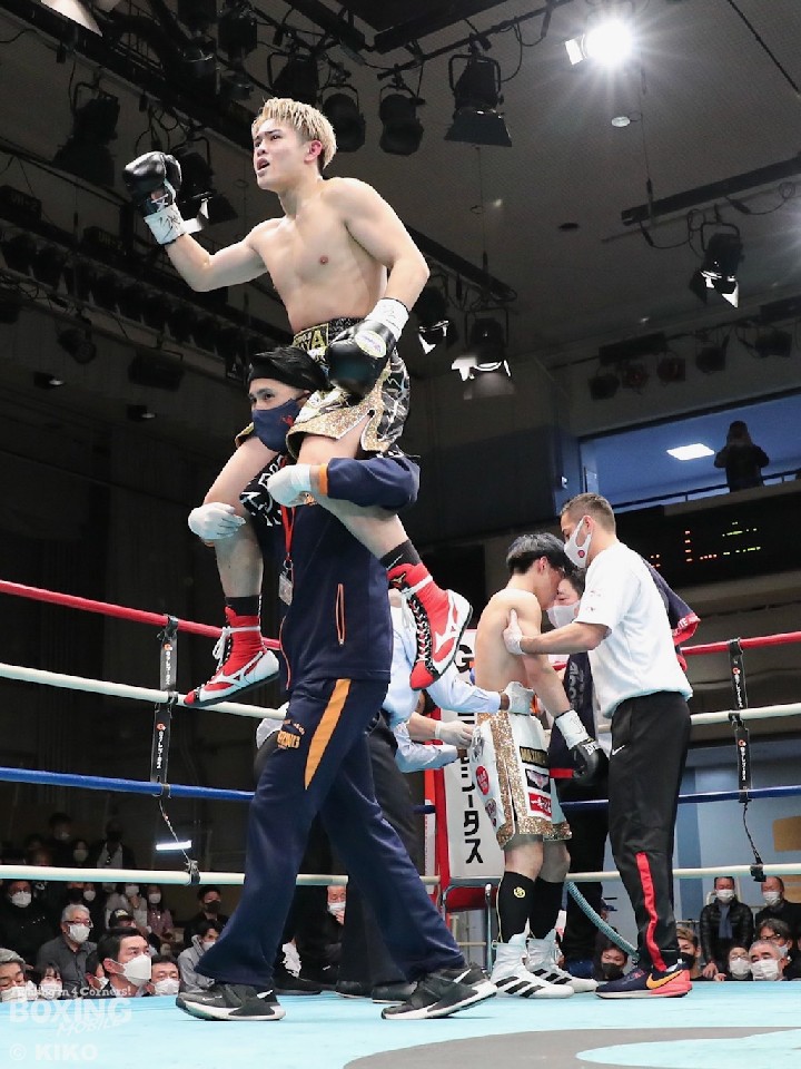 まさに、スター誕生だ! 開始早々、豊嶋が距離を詰めて、左ボディ、右フックを打ち込み先制攻撃。真っ向から応じた佐々木は、左フックでグラつかせると、攻め急ぐことなくジャブからボディブローを決めて攻勢。左フックで痛烈なダウンを奪うと、レフェリーはカウント途中で、試合をストップした。佐々木が衝撃の初回KO勝ちで、新チャンピオンに輝いた。