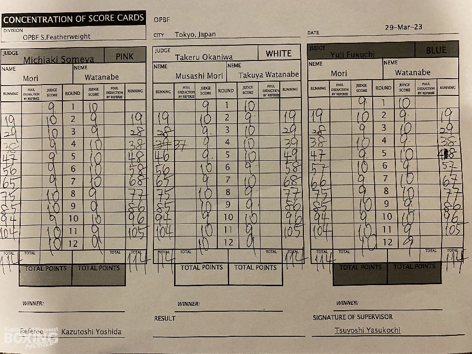 前半は、中間距離での攻防を繰り広げたが、渡邉の右ストレートが顔面を捉えた。3回になると、体を密着させながらショートパンチの応酬。4回終了時の公開採点は、38-38×2、39-37×1で渡邉がリード。中盤もお互いの意地がぶつかり合う打ち合いを見せたが、渡邉のショートアッパーが冴えわたった。8回終了時の公開採点は、77-75×3で渡邉が差を広げた。9回、森はさらに圧力を強めて左を強振。11回は手数が減った渡邉を攻め立て猛追。最終12回も激しく打ち合った。ジャッジ3者ともに114-114とし、新チャンピオンは誕生しなかった。