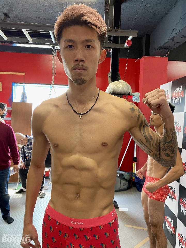 日本スーパーフェザー級タイトルマッチの前日計量が31日、大阪市内のジムで行われ、王者の坂晃典(31=仲里)と同級1位の原優奈(28=真正)が計量に臨んだ。