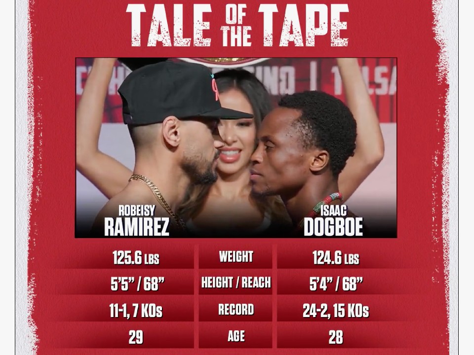 WBO世界王座決定戦の前日計量が31日、米国オクラホマ州で行われ、同級2位のロベイシー・ラミレス(29=キューバ)と、元WBOスーパーバンタム級王者のアイザック・ドグボエ(28=英/ガーナ)が顔を合わせた。試合は、日本時間の2日、タルサのハードロックホテル&カジノで開催される。
