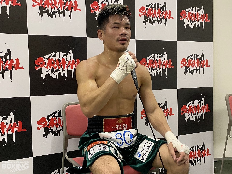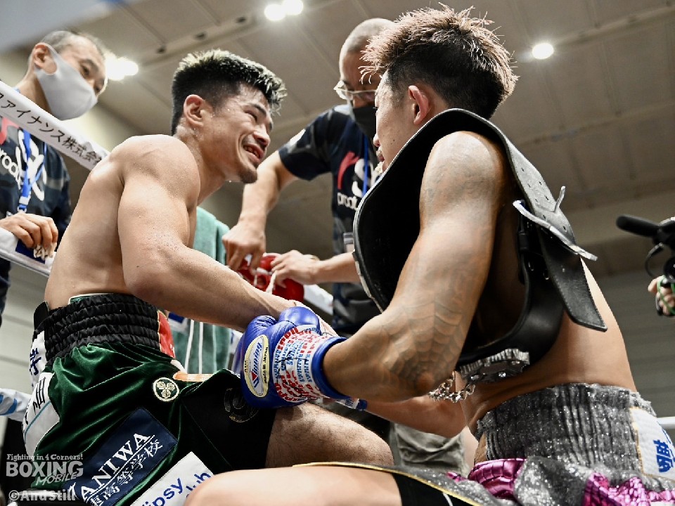 「格好いいっすね」。新チャンピオンは肩にかけたベルトを見て微笑んだ。「右は当たると思っていたので、どう当てていこうかと考えていたところに、ポカ(ダウン)をしてしまった。しかし、ラウンドを重ねるごとに効いているのはわかったので、冷静に料理していこうと思った」。「リスペクトのない選手には挑発はしない。強いチャンピオンに勝つことができた」と試合を振り返った。