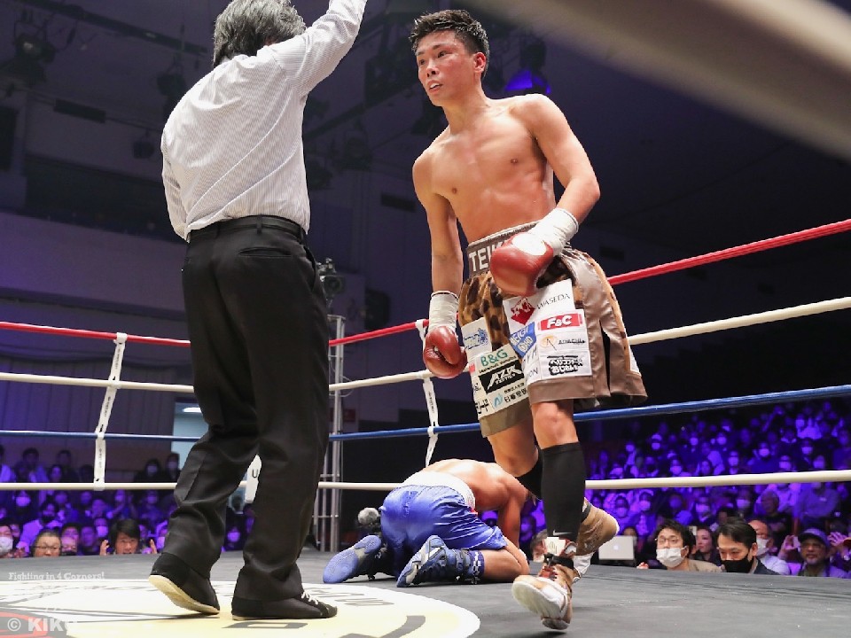 そんな中、岩田翔吉(27=帝拳)が第三試合に出場。試合が決まったのは3回。カウンターに右ストレートを合わせた岩田が、ジェローム・バロロ(比)の顔面を打ち抜くとダウン。すぐにバロロは立ち上がったが、岩田が左ボディを打ち込んで再起を飾った。