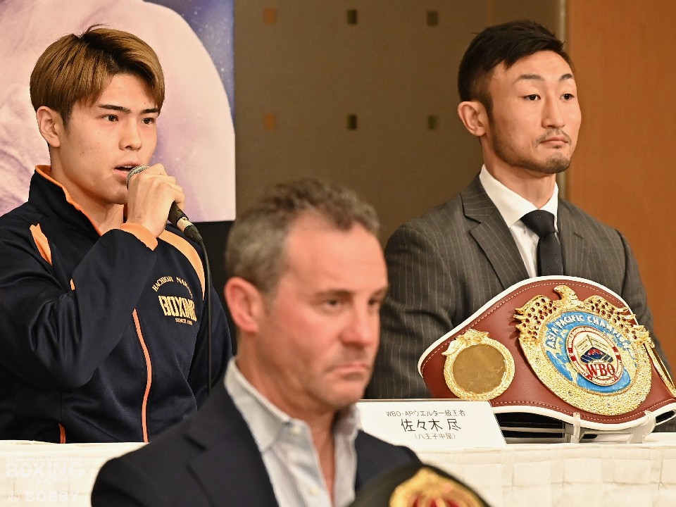 WBOアジアパシフィック・ウェルター級タイトルマッチの記者会見が6日、都内のホテルで開かれ、王者の佐々木尽(21=八王子中屋)と同級1位の小原佳太(36=三迫)の両者が静かに闘志を燃やした。