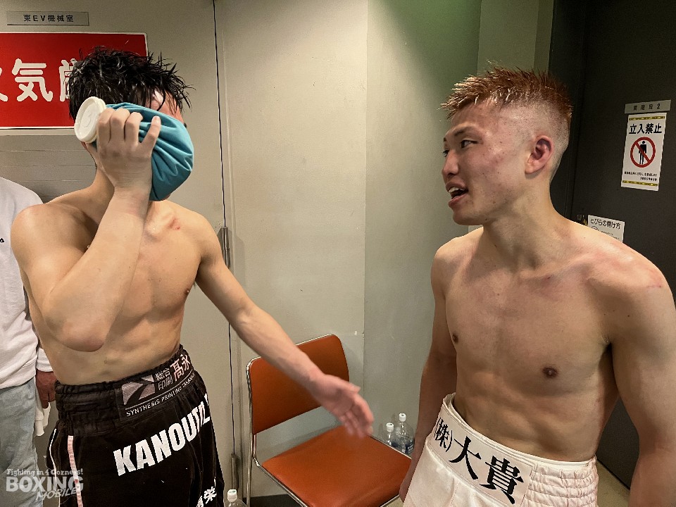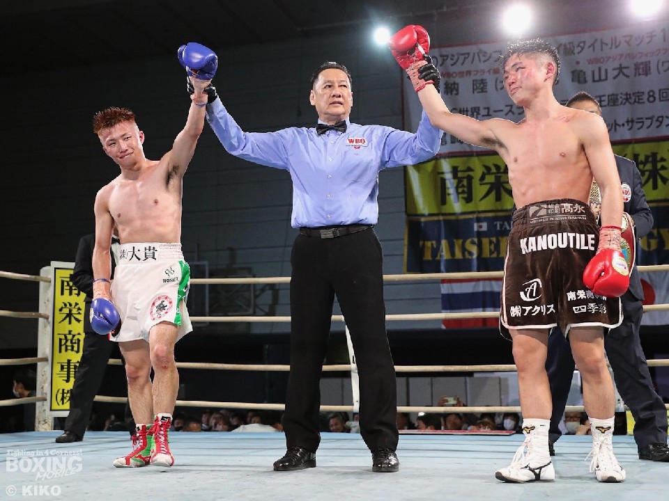 注目のサウスポー対決は、右アッパーからの左ストレートで、加納の顔面にパンチを集めた亀山に対して、右目下を腫らしながらも、前に出て左ストレートを返した加納が、最後までスタミナを切らすことなく手数で応戦。加納がドロー防衛を果たした。試合後には、互いに健闘を称え合った。