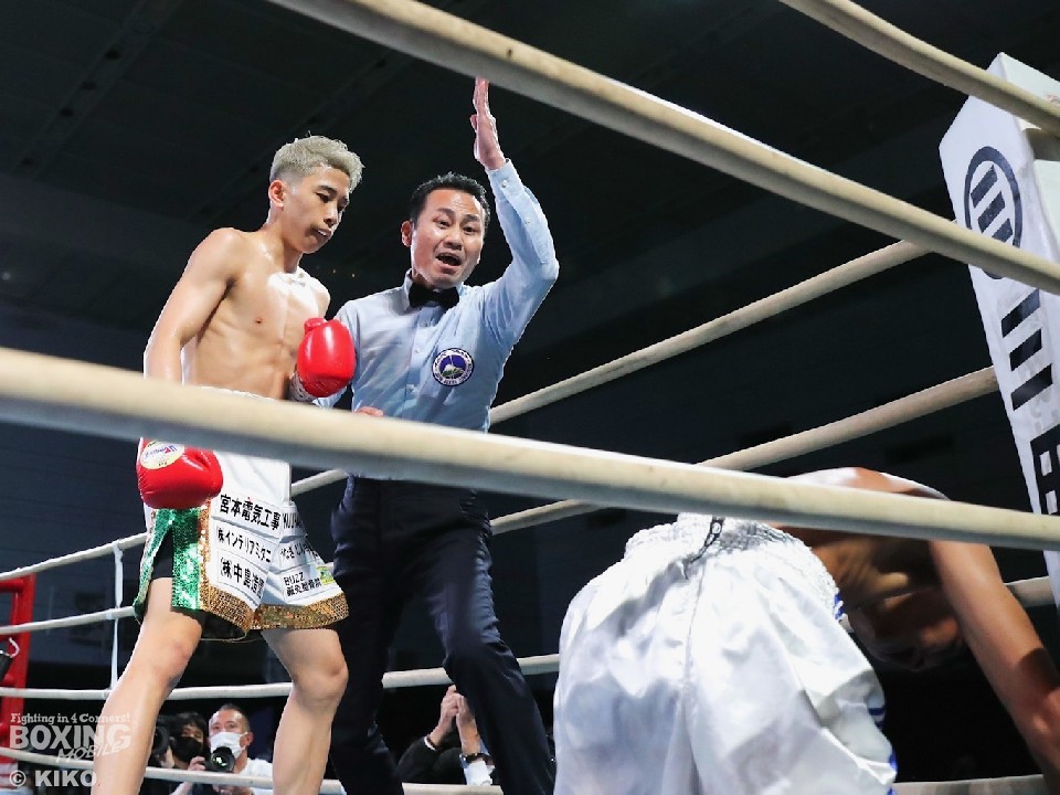 左右のアッパーと左ストレートでリズムを作った尾崎は、バオラブットからダウンを奪って、序盤にペースを掴むと、慌てることなく、パンチをまとめてWBCユースタイトル獲得を果たした。